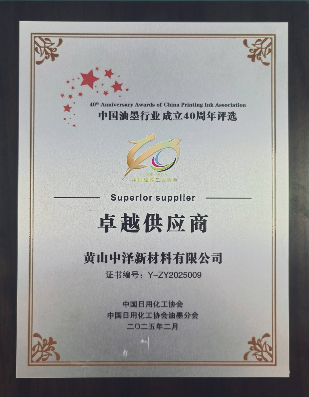 喜讯丨中泽公司荣获“油墨行业40周年”系列卓越供应商